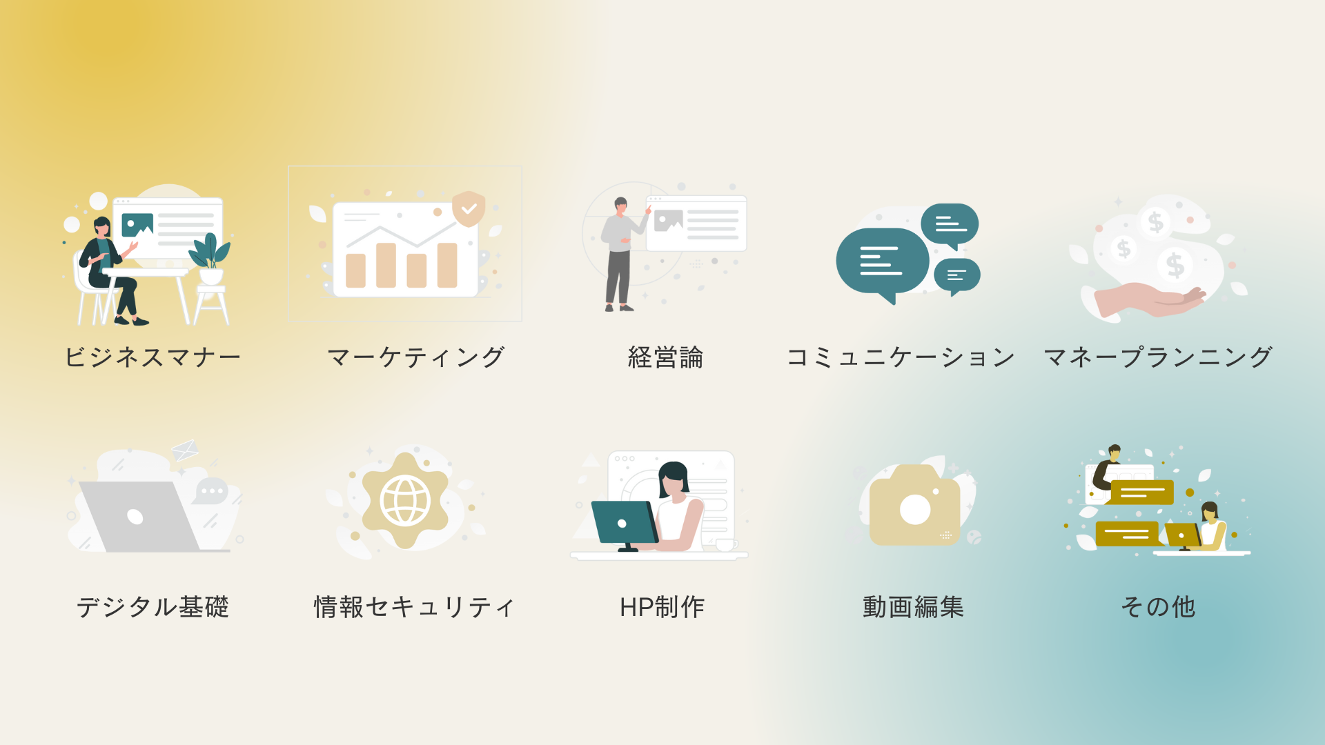 ヒアリングの結果、デジタルに関するスキルが学べる「デジタル基礎」や、在宅ワークの需要がありそうな「HP制作」や「動画制作」に関する学習を中心に行うことになった。