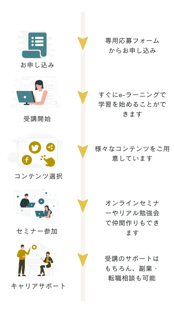 お申込みの後はすぐに学習をスタートすることができます。また副業や転職を考えられている受講者には担当者が面談を行い、希望や適性などを踏まえて受講するコンテンツを一緒に考えていく機会も用意しております。皆さんのデジタルスキル習得や将来やりたいことの実現に向けて寄り添いながらサポートしていきます。